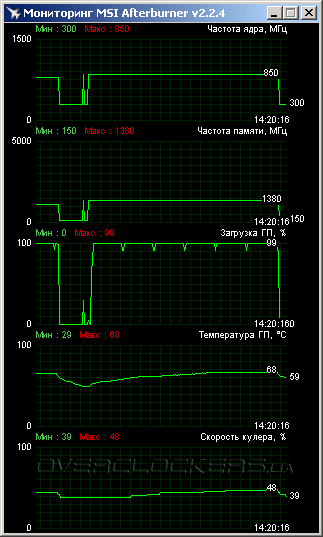 При таком разгоне видеокарта прогрелась лишь до 68 °C в тесте Crysis без какого-либо дополнительного обдува радиатора.