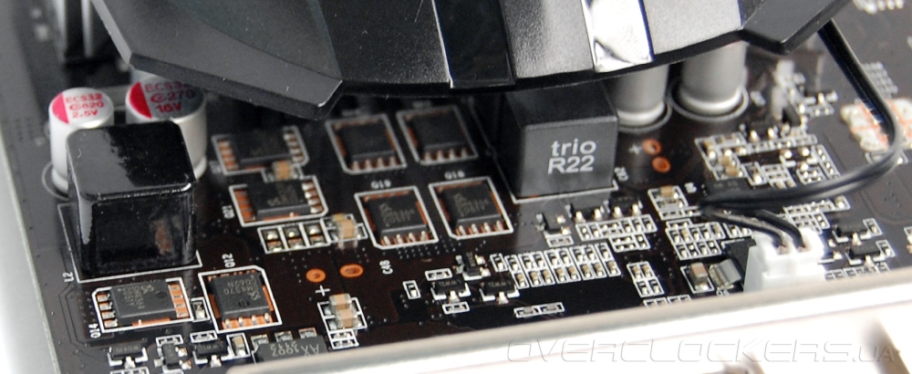 Изучение платы подтверждает ее идентичность референсному дизайну. Графический процессор запитан от двухфазного преобразователя напряжения, на питание памяти GDDR5 идет одна фаза.