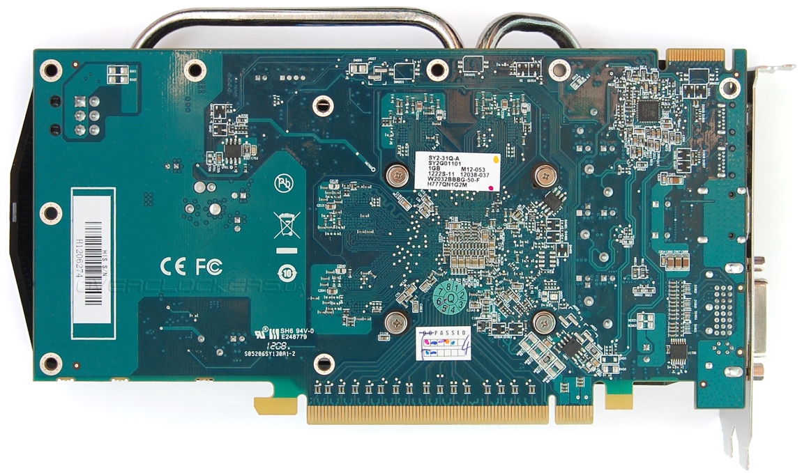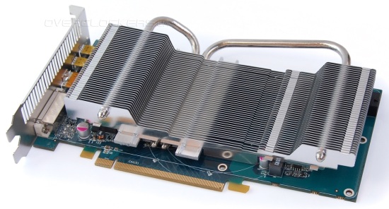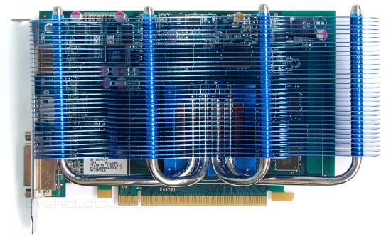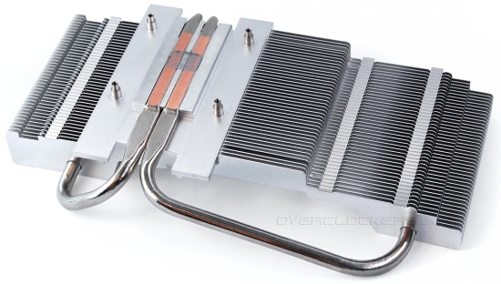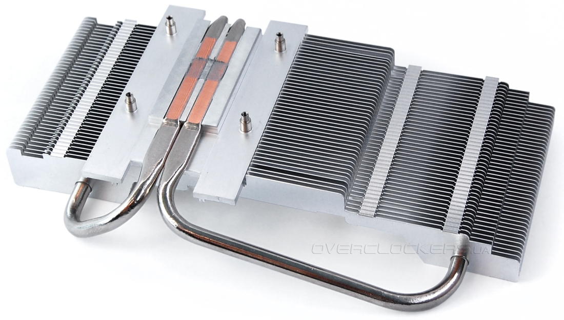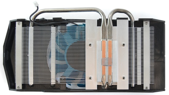 Под кожухом скрывается массивный радиатор, который пронизывают две тепловые трубки. Осуществляется прямой контакт трубок с поверхностью кристалла GPU. Правда расстояние межу трубками довольно большое, поэтому центр чипа контактирует с алюминиевым основанием.