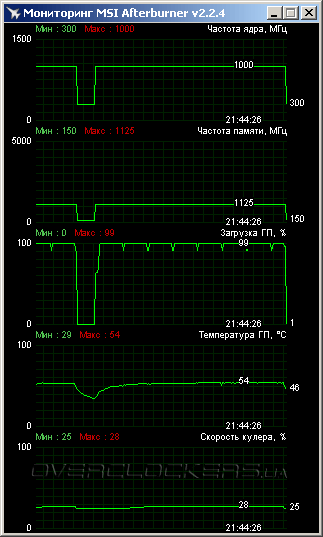 Разгонный потенциал высокий. Нам удалось добиться стабильной работы при частоте GPU в 1225 МГц. Для этого понадобилось напряжения до 1,237 В, дальнейшее его повышение не приносило практической пользы. Результат самый высокий среди всех Radeon HD 7770 побывавших у нас Хотя отрыв HIS от конкурентов небольшой — MSI R7770 Power Edition 1GD5/OC уступил лишь 10 МГц. Разгон памяти тоже высокий — 6000 МГц. Но это уже на 80 МГц ниже результата MSI.