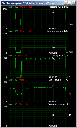 На таких частотах видеокарта не смогла работать в тихом режиме. Для прохождения всех тестов пришлось поднимать обороты. Мы остановились на отметке в 55%, что на самом деле уже очень громко. Вентилятор создает заметный гул даже при превышении порога в 35%. Так что практический разгон при сохранении приемлемого уровня шума будет меньше. Характеристики тестируемых видеокарт