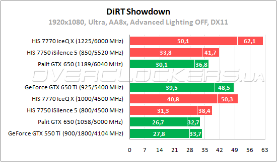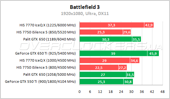 GeForce GTX 650 немного уступает Radeon HD 7750 и даже GeForce GTX 550 Ti. При разгоне младший HIS сохраняет свое преимущество. Radeon HD 7770 слабее GeForce GTX 650 Ti на 17—20%. Повышение частот HIS 7770 IceQ X позволяет обойти конкурента на 3—7%.