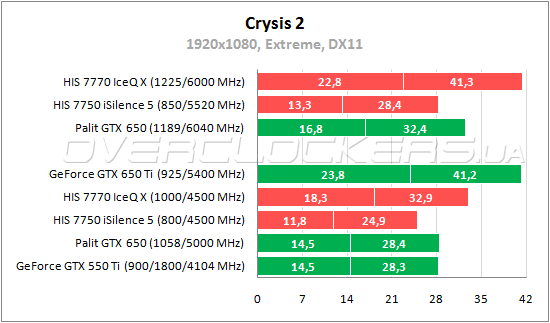 Преимущество GeForce GTX 650 над Radeon HD 7750 сохраняется и в Crysis 2. Младшему HIS удается выйти на уровень производительности конкурента лишь при разгоне до 850/5520 МГц. А разогнанный Palit приближается по производительности к Radeon HD 7770. Последний при повышении своих частот выходит на один уровень с GeForce GTX 650 Ti.