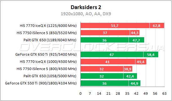 GeForce GTX 550 Ti преподносит сюрприз в Darksiders 2, обгоняя новый GeForce GTX 650 на 12,5% по минимальному fps и на 6% по среднему fps. Radeon HD 7750 слабее GeForce GTX 650 на 9% по среднеигровой частоте кадров, а Radeon HD 7770 лучше на 28% и 17%. Разгон повышает результаты Palit на 12,5%, младший HIS от ускорения до 850/5520 МГц выигрывает 16% и 14%. Старший HIS увеличивает свои результаты при разгоне на 26—27%, что позволяет наконец-то обогнать GeForce GTX 650 Ti.