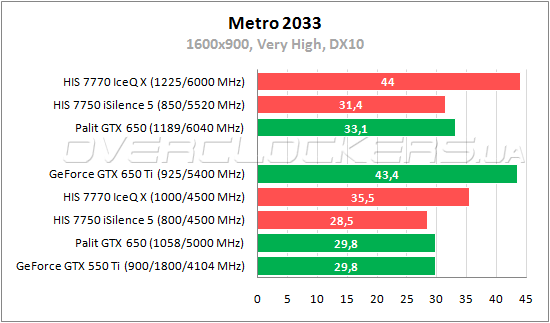 В Metro 2033 видеоадаптер Palit возвращает преимущество над Radeon HD 7750, хотя разница между ними небольшая — менее 5%. Radeon HD 7770 производительнее GeForce GTX 650 на 19%.