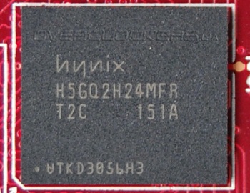 Распаяно четыре микросхемы памяти GDDR5 от Hynix с маркировкой H5GQ2H24MFR-T2C.