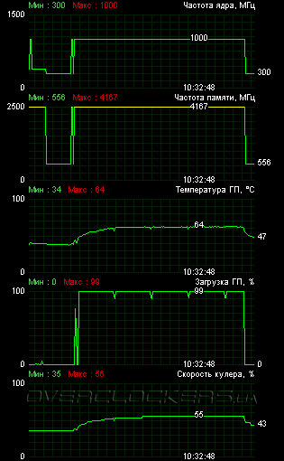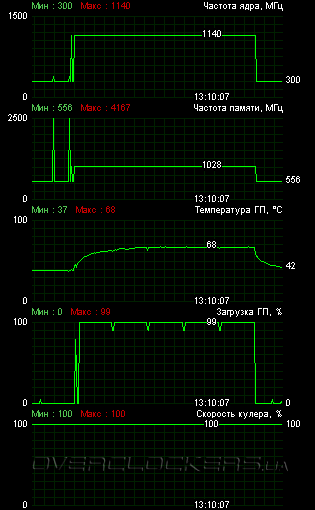 В игровом режиме ядро грелось лишь до 64 °С. Но шум при этом был очень заметный, хотя вентилятор и раскручивался лишь до 55% от своего максимума.