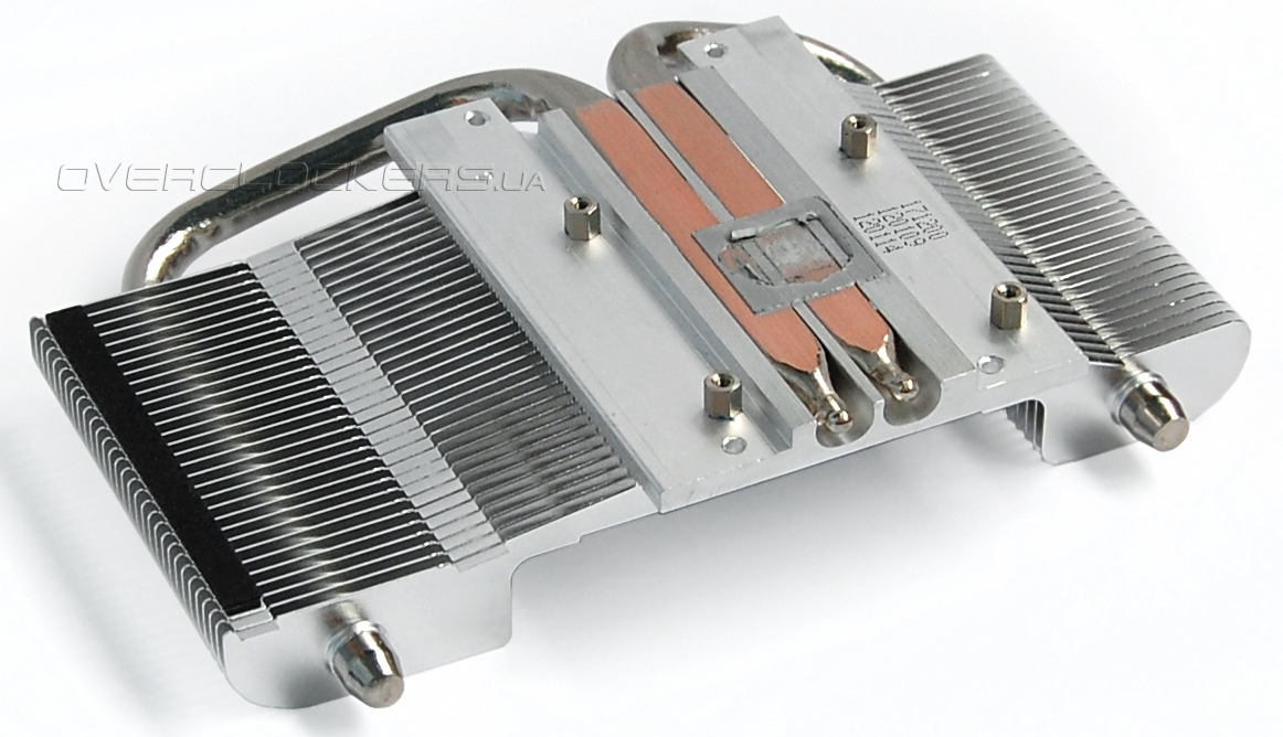 В конструкции кулера используется две толстые тепловые трубки диаметром 8 мм. Как видно по отпечатку термопасты, одна трубка проходит через середину графического чипа, а вторая лишь частично контактирует с кристаллом.