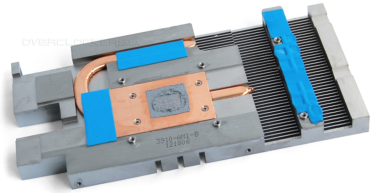 В основании есть медная вставка и приплюснутая тепловая трубка. Медный «пятачок» отводит тепло от графического чипа. Через голубые термопрокладки осуществляется контакт с микросхемами памяти и компонентами узла питания. Но из-за разной толщины основания и тепловой трубки контакт с двумя микросхемами неполный.