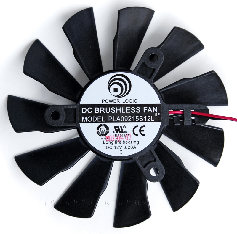 Основной вентилятор PowerLogic PLA09215B12H, дополнительный — PowerLogic PLA09215S12L. Они одинакового диаметра — 92 мм. Для второго заявлена скорость 2500 об/мин при шуме 25,9 дБ. Спецификации основного вентилятора не приводятся, но скорость его вращения выше.