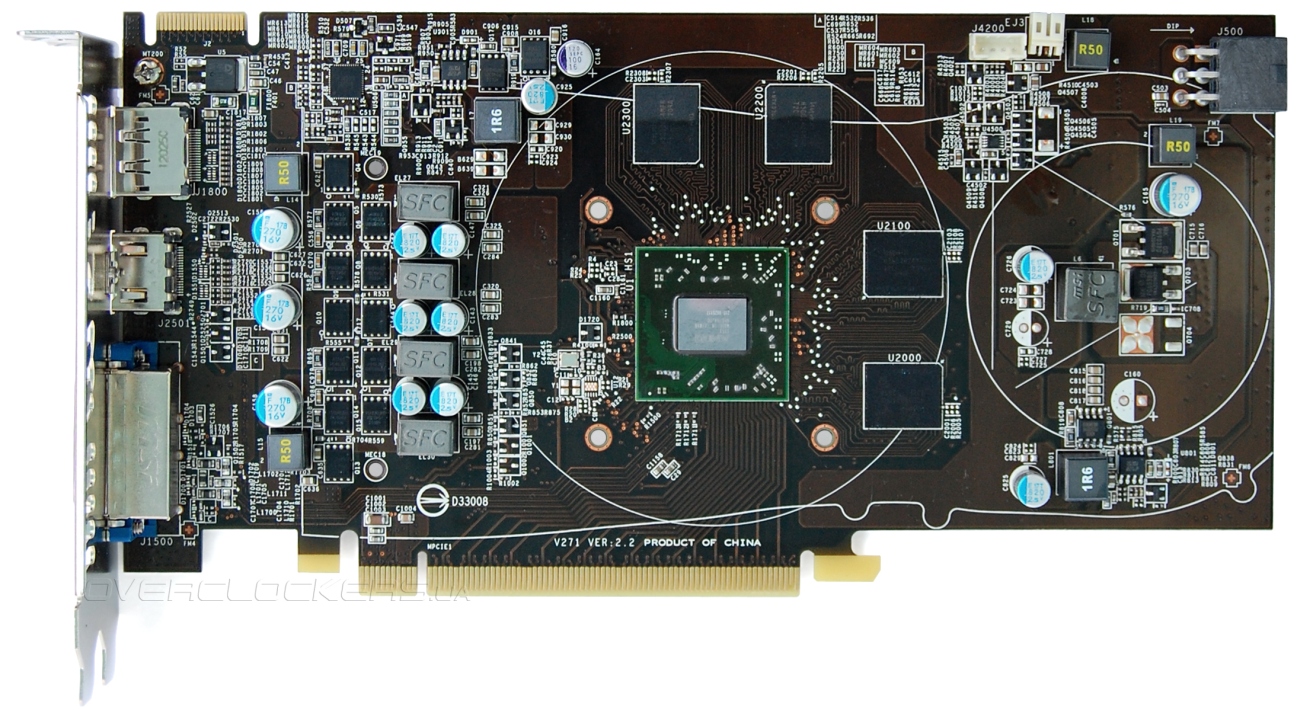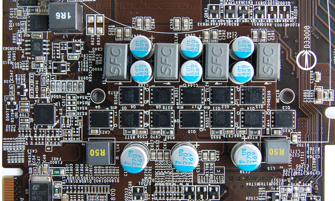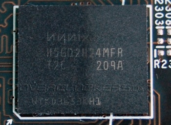 Один гигабайт видеопамяти набран четырьмя микросхемами Hynix H5GQ2H24MFR T2C.
