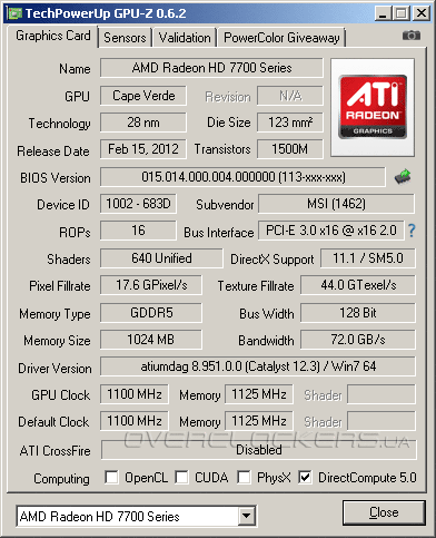 Приставка OC в названии модели говорит о повышенных частотах. Данная карта функционирует на 1100/4500 МГц. Хотя после планируемого повышения частот видеокарт AMD для HD 7770 частота в 1,1 ГГц станет стандартом. Данная частотная формула не самая высокая. Из протестированных нами моделей ASUS HD7770-DCT-1GD5 может похвастать чуть большей частотой GPU, а Gigabyte GV-R777OC-1GD — более быстрой памятью.