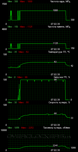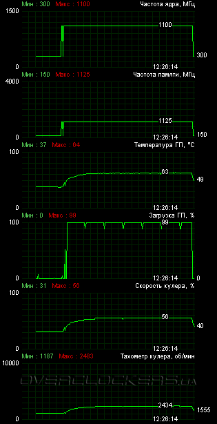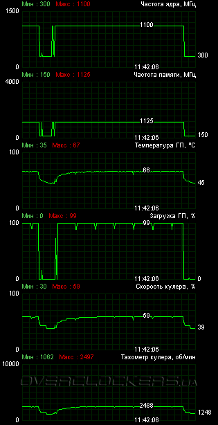 При 12-минутной нагрузке Crysis: Warhead карта прогрелась до 67 °C в стандартной конфигурации с одним вентилятором (26 °C в помещении, открытый корпус). Скорость вентилятора достигала 2488—2497 об/мин в пике. Шум весьма заметный.
