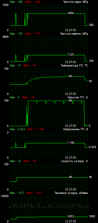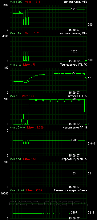 В данном режиме температура GPU легко достигала 78 °C. Для длительного использования такой режим не очень подходит. Подключение второго вентилятора без изменения скорости основного снижало пиковую температуру на 4 °C.