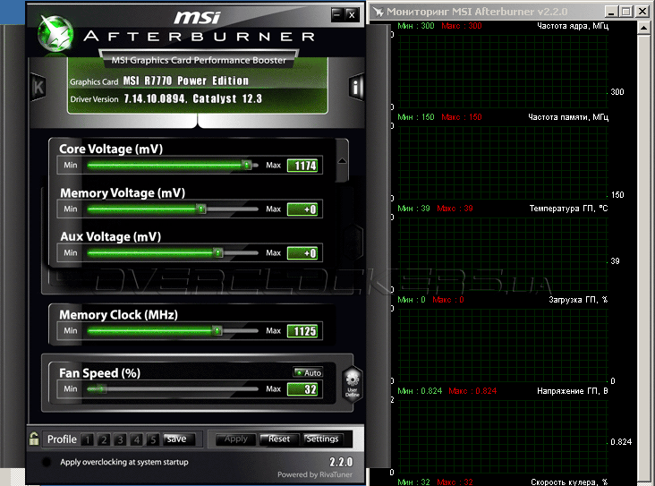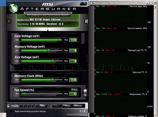 Кстати, насчет напряжений. У видеокарты доступно для программного изменения три параметра. Но по неизвестной причине софтвольтмод работал только в MSI Afterburner 2.2.0, в более новой версии 2.2.1 этой функции не было. Надеемся в свежей версии 2.2.2 это досадное недоразумение исправлено.