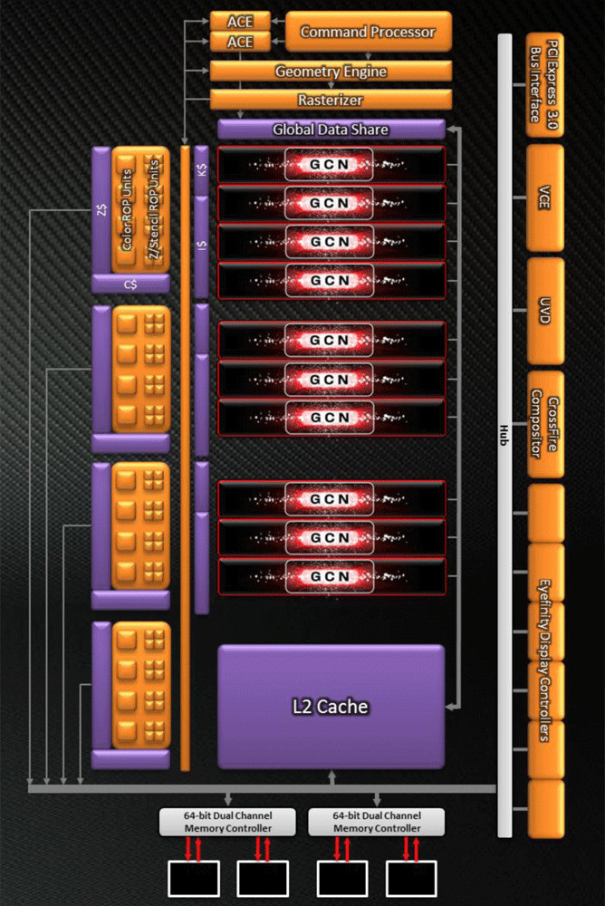 В основе новинок лежит графический процессор Cape Verde, который состоит из 10 GCN Compute Unit. Для сравнения, у флагмана Radeon HD 7970 таких блоков 32. Каждый юнит включает 64 потоковых процессоров, т.е. всего их 640. Объем кэш-памяти L2 достигает 512 КБ. Текстурных блоков 40, блоков ROP — 16. Два 64-битных контроллера обеспечиваю обмен данными с памятью GDDR5 по 128-битному интерфейсу.