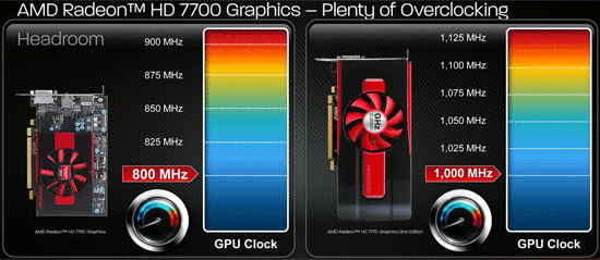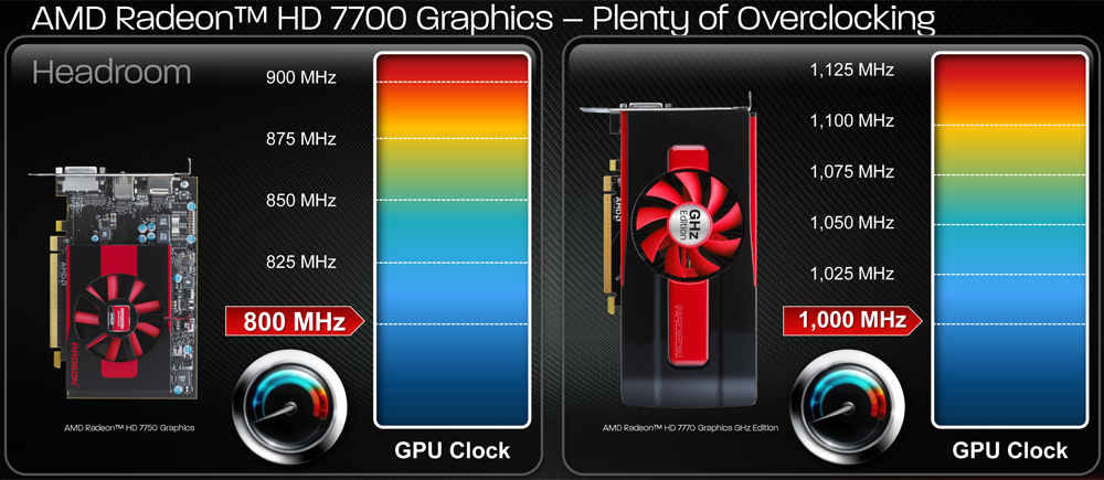 Свое преимущество дают и повышенные рабочие частоты. У Radeon HD 7770 графический процессор работает на частоте 1 ГГц, что является своеобразным рекордом для видеокарт AMD. Среди NVIDIA референсных моделей с такой частотой тоже не было, хотя некоторые партнеры успели выпустить GeForce GTX 560 Ti с частотой ядра 1000/2000 МГц. Но такие продукты производились ограниченным тиражом на отборных чипах. А в случае с Radeon HD 7770 еще можно надеяться на неплохой разгон. На это намекает следующий слайд компании AMD.