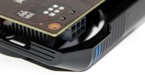 Кстати, у этого кожуха есть один недостаток. Арка над разъемом питания очень низкая. После подключения дополнительного питания нет доступа к защелке для извлечения соответствующего коннектора. При попытке извлечения пальцами плата значительно выгибается. Это, конечно, мелочь, но довольно неприятная. ASUS для безопасного извлечения при затрудненном доступе к разъемам снабжает свои карты соответствующими переходниками (как у EAH6770 DC SL/2DI/1GD5). А в данном случае и переходников никаких не надо, достаточно увеличить глубину выреза в пластике.
