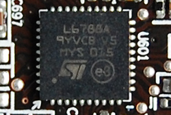Система питания графического процессора включает три фазы под управлением контроллера L6788A от STMicroelectronics, вынесенного на обратную сторону платы.