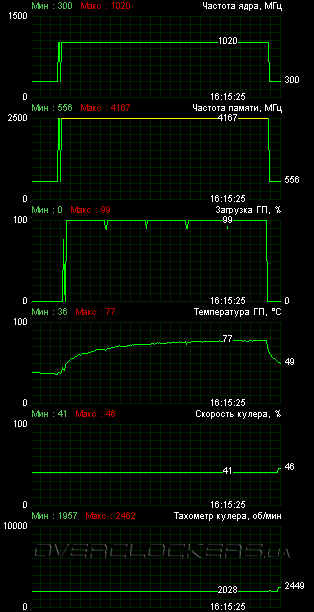 Мы решили утихомирить видеокарту и ограничили скорость вентиляторов отметкой в 41% (примерно 2000 об/мин), оставив напряжение без изменений. В итоге температура возросла 77 °C. Не сказать, что это слишком много, но для кулера с двумя вентиляторами результат слабоват.