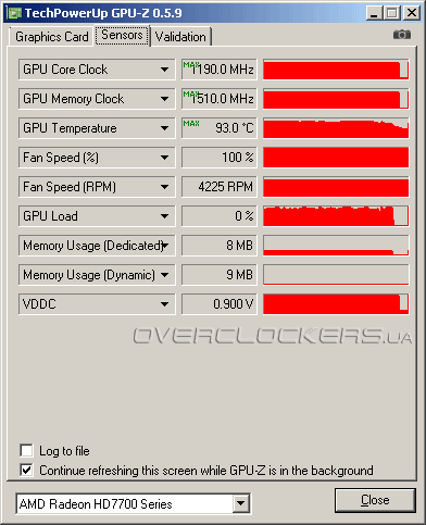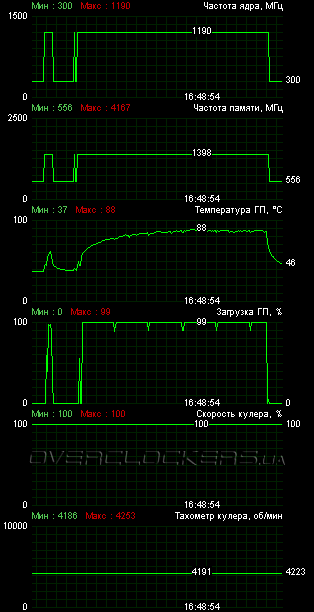 При этих частотах были пройдены все тесты, хотя под конец все же возникли проблемы из-за перегрева, и пришлось дать карте остыть. Но это произошло лишь через несколько часов активной нагрузки, а не через полчаса, как при частоте 1200 МГц и напряжении 1,225 В. Но и при 1,212 В карта тоже успела прогреться 93 °C.