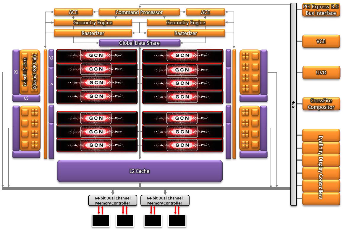 Новый чип, получивший кодовое имя Bonaire, состоит из 14 GCN Compute Unit, структура которых полностью идентична аналогичным блокам у старых решений архитектуры GCN. Общее количество потоковых процессоров — 896, текстурных блоков — 56. Напомним, что у старшего Pitcairn насчитывается 20 таких юнитов, младшая версия в лице Radeon HD 7850 имеет в своем активе 16 блоков, а у более простого GPU Cape Verde лишь 10 Compute Unit. Как видим, новый Radeon HD 7790 по вычислительной мощи ближе к Radeon HD 7850, а не к Radeon HD 7770.
