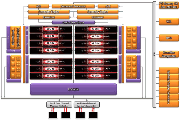 В основе новинки не какой-то порезанный старый чип, а совершенно новый GPU, построенный на архитектуре GCN 1.1, что означает некоторые улучшения со времен первых графических процессоров GCN. Но реальные изменения коснулись лишь работы энергосберегающих технологий. Еще появилась поддержка инструкций для гетерогенной архитектуры (Heterogeneous System Architecture), которая предполагает совместное использование вычислительных возможностей CPU и GPU.