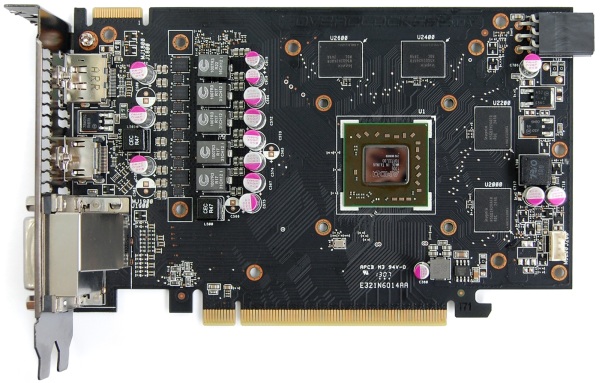 Плата выполнена на текстолите черного цвета. Узел питания GPU расположен в левой части. Радиатора на силовых компонентах нет, хотя его установку предусматривают соответствующие отверстия.