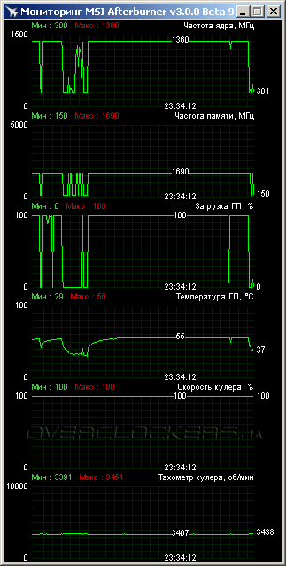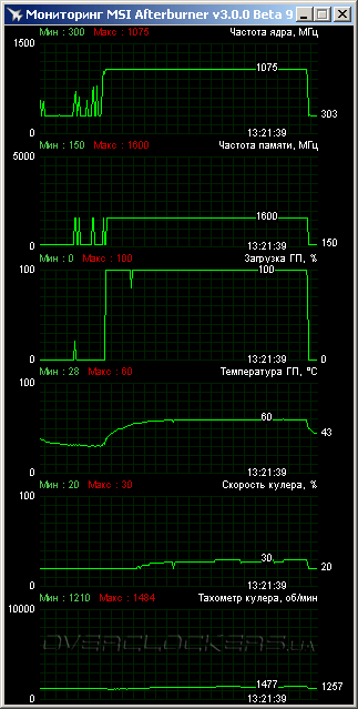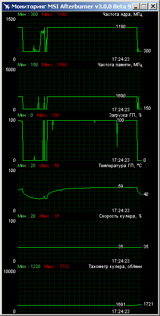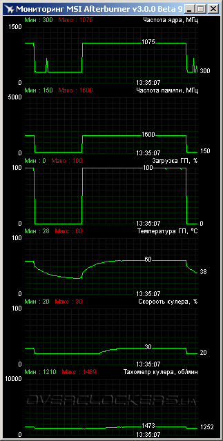 По итогам 10 минут прогревания тестом MSI Kombustor температура все еще не превысила 60 °C, вентиляторы уже постоянно работали на 1480 об/мин без периодического снижения скорости.