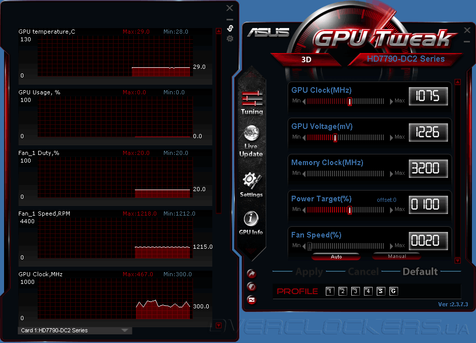 Настало время поговорить о разгоне. Важную роль в этом играет возможность программного управления напряжением. Поддержка этой функции отсутствовала у некоторых моделей Radeon HD 7770 и Radeon HD 7850. Аналогичная ситуация складывается и с Radeon HD 7790 — не все карты поддерживают софтвольтмод. ASUS HD7790-DC2OC-1GD5 позволяет регулировать напряжение, но только через утилиту ASUS GPU Tweak. При этом у программы есть такая проблема, как невозможность регулировки частоты памяти GDDR5. В итоге все равно придется прибегать к сторонним утилитам. При этом еще нужно придерживаться определенного порядка разгона: вначале повышать напряжение в ASUS GPU Tweak, а потом уже регулировать частоты в MSI Afterburner.