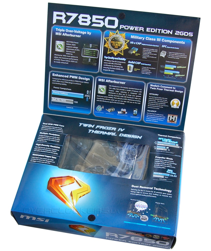 Данная видеокарта поставляется в коробке, которая напоминает упаковку R7770 Power Edition. По логотипу в левом нижнем углу становится ясно, что данная модель оснащена системой охлаждения Twin Frozr IV.