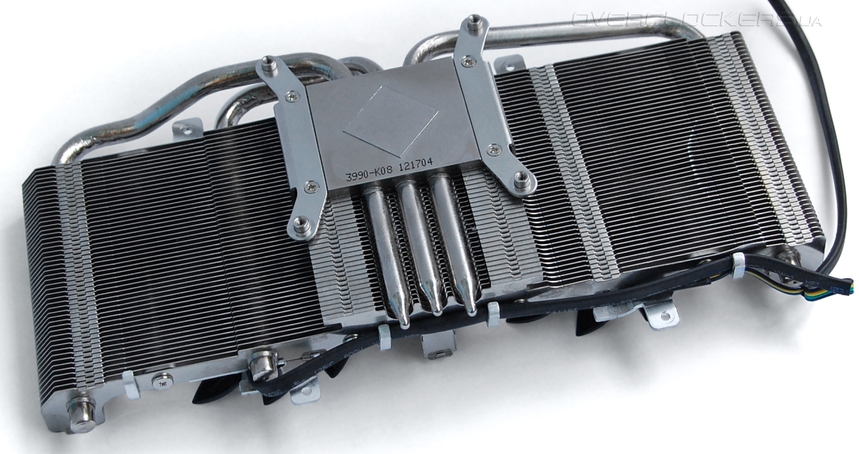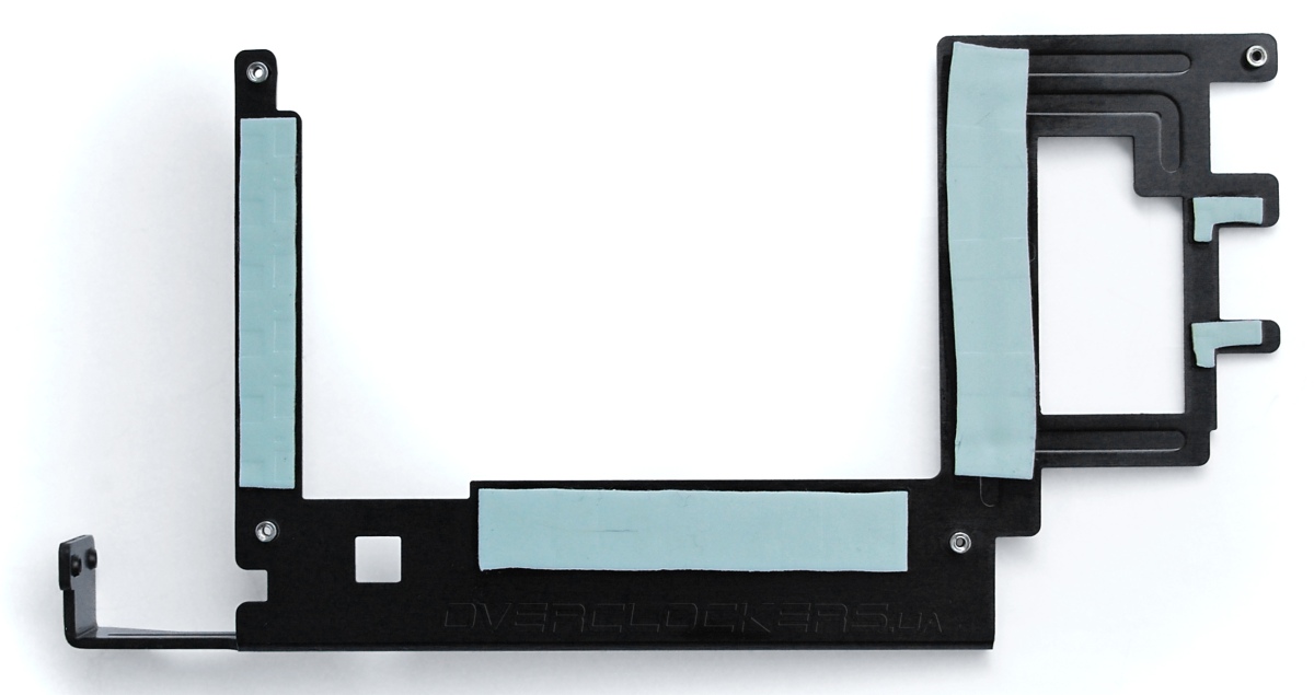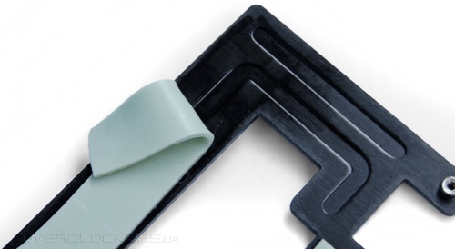 Данный радиатор отводит тепло и от микросхем памяти. Вот только с одной стороны пластина имеет желобки, из-за чего контакт с чипами GDDR5 неполный. Компенсировать неровную поверхность помогает термопрокладка.