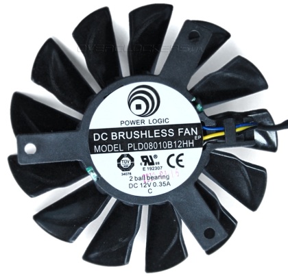 Традиционно используется пара вентиляторов по 80 мм. В данном случае это Power Logic PLD08010B12HH. С недавних пор все видеокарты MSI перешли на вентиляторы с двойным шариковым подшипником и R7850 Power Edition не исключение.