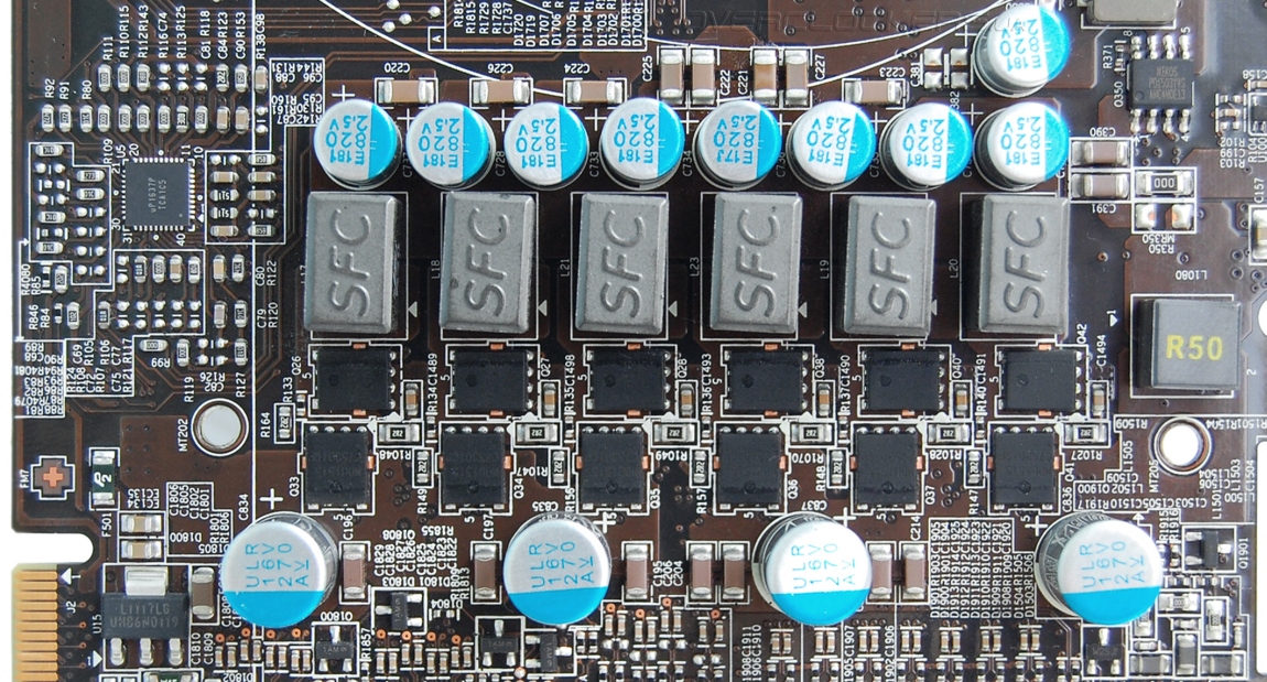 Видеокарты Power Edition всегда имеют усиленную систему питания. В данном случае преобразователь напряжения GPU использует 6 фаз под управлением контроллера uP1637P.