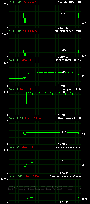 Производитель поднял частоты видеокарты до 950/4800 МГц. Рекомендованные значения — 860/4800 МГц. Как видим, память заводскому разгону не подверглась.