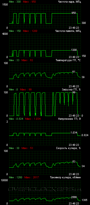 Для начала мы решили достичь максимальных частот при самых высоких оборотах обдувающих вентиляторов. После длительных экспериментов остановились на 1130/5800 МГц. На фоне результатов разгона Radeon HD 7870 такие значения не впечатляют. Хотя немного пробежавшись по разным обзорам Radeon HD 7850 в Интернет, можно сказать, что для этих карт и такой разгон вполне отличный.