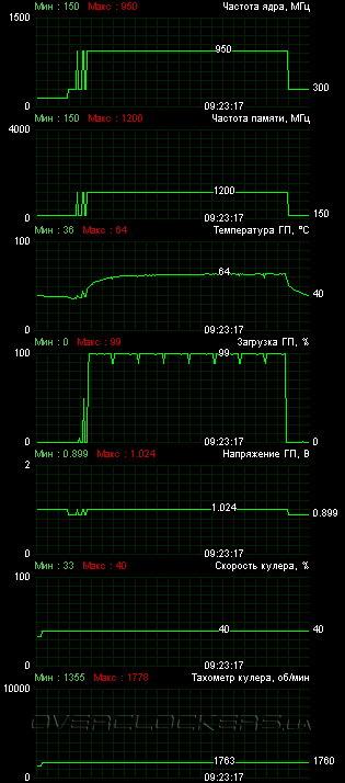 Такие низкие рабочие температуры говорят о том, что можно смело понижать обороты вентиляторов для достижения более комфортного уровня шума. Мы зафиксировали скорость вентиляторов на одном уровне (1770 об/мин) при помощи MSI Afterburner и немного понизили рабочее напряжение с 1,034 до 1,024 В. И в таком режиме видеокарта в тесте Crysis прогрелась лишь до 64 °C. Отличный результат.