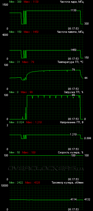 Для полной стабильности на 1130 МГц питающее напряжение пришлось повышать аж до 1,21 В. И грелась видеокарта при этом очень сильно. В Crysis температура легко достигала 79 °C, в некоторых приложениях была еще на несколько градусов выше.