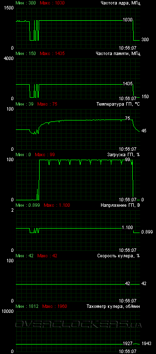 Дополнительно мы решили поэкспериментировать с разгоном в тихом режиме. После длительных тестов остановились на частотной формуле 1030/5740 МГц при напряжении 1,1 В. Остаться на 1770 об/мин при этом не удалось, но при 1940 об/мин видеокарта была вполне стабильна, хотя тоже сильно грелась. Из-за высокого нагрева пришлось немного скинуть и частоту памяти.