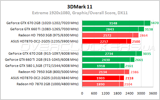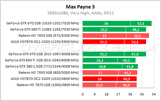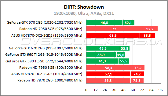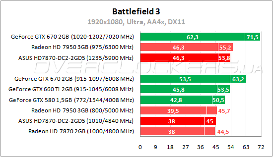 В прошлых частях этой игровой серии безоговорочно лидировали карты NVIDIA. Теперь же разработчики сильно постарались оптимизировать приложение под AMD. В итоге даже простой Radeon HD 7870 обходит GeForce GTX 670 с огромным отрывом. Разница с Radeon HD 7950 минимальная и ASUS уступает этой карте лишь один fps. Разгон поднимает производительность на 20—21%.