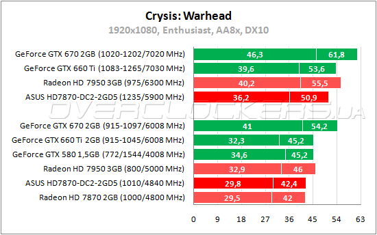 В дополнении Warhead к первому Crysis видеокарты Radeon HD 7870 снова проигрывают GeForce GTX 660 Ti и GeForce GTX 580. У HD7870-DC2-2GD5 преимущество над референсом в 1%. Разгон ускоряет карту на 21%.