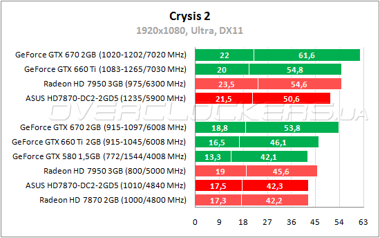 Во втором Crysis 2 по среднеигровой частоте кадров Radeon HD 7870 и GeForce GTX 580 оказываются на одном уровне, но просадки в сценах с множеством брызг и пыли на видеоадаптерах AMD меньше. По минимальному fps они уступают только GeForce GTX 670. У ASUS с референсом снова мизерная разница, а разгон повышает производительность на 20—23%, что позволяет легко обогнать Radeon HD 7950.