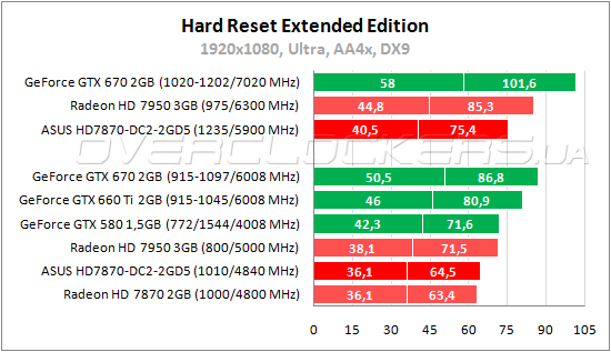 В игре Hard Reset у ASUS и обычного Radeon HD 7870 разница чуть больше одного процента, но лишь по среднему fps. От Radeon HD 7950 герой данного обзора отстает на 6—11%, от GeForce GTX 580 на 11—17%. Разгон помогает выйти на уровень производительности старого флагмана NVIDIA.
