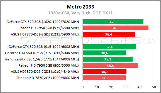 В игре Metro 2033 у Radeon HD 7870 и GeForce GTX 660 Ti паритет. С Radeon HD 7950 разница более 26%, с GeForce GTX 580 — 14%. Последнего конкурента удается немного обойти при повышении частот ASUS до 1235/5900 МГц.