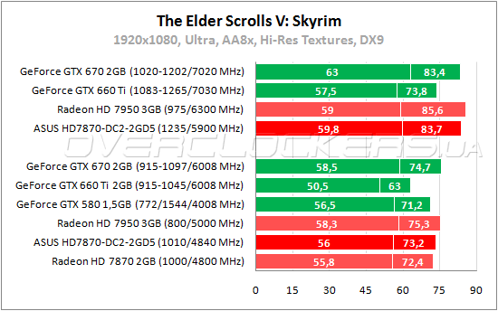 В Skyrim наш ASUS идет примерно на одном уровне с GeForce GTX 580, выигрывая пару кадров по среднему fps. GeForce GTX 660 Ti в данном случае аутсайдер.