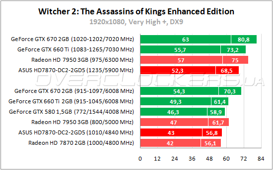 Во втором «Ведьмаке» последнее место вновь занимает простой Radeon HD 7870. У ASUS мизерное преимущество над ним при отставании в 9% относительно Radeon HD 7950. Обойти старшего собрата вместе с GeForce GTX 580 и GeForce GTX 660 Ti позволяет разгон до 1235/5900 МГц.