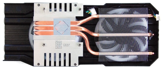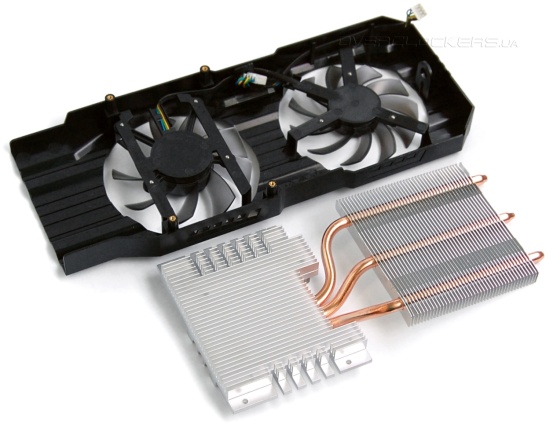 Сразу видно, что вместо обновленного двухслотового DirectCU II используется старая версия с двухсекционным радиатором и двумя разными вентиляторами.