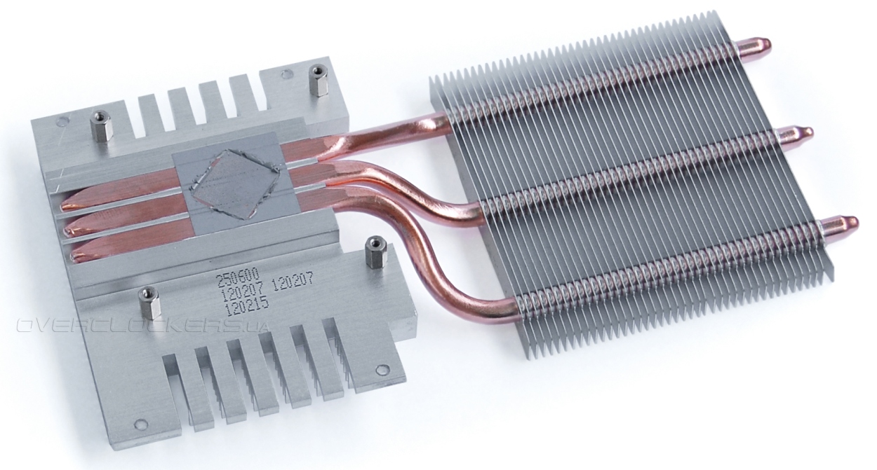 В основании цельного радиатора уложены три тепловые трубки, напрямую контактирующие с поверхностью чипа. С верхней стороны этот радиатор имеет ребристую поверхность. Массив пластин немного приподнят над основанием.