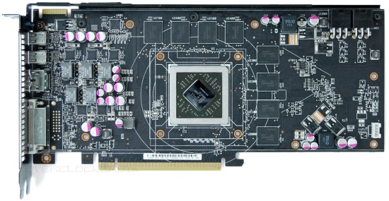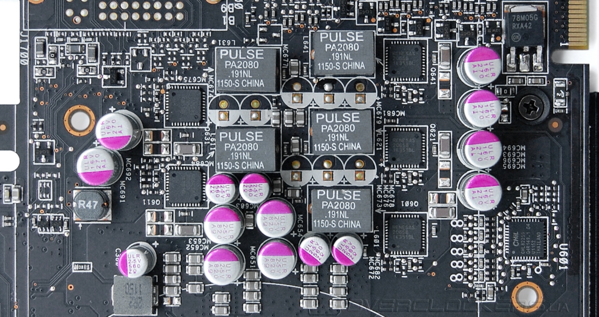 Система питания графического процессора насчитывает пять фаз, реализованных на микросхемах DrMOS производства Renesas Technology под управлением контроллера CHil CHL8225G. Никакого радиатора не предусмотрено, хотя плата и все компоненты неплохо обдуваются вентиляторами системы охлаждения. Но если вы обратитесь к самым первым фотографиям, то увидите, что вентилятор расположен немного сбоку от узла питания.