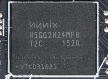 Два гигабайта видеопамяти набраны восемью микросхемами Hynix H5GQ2H24MFR T2C.